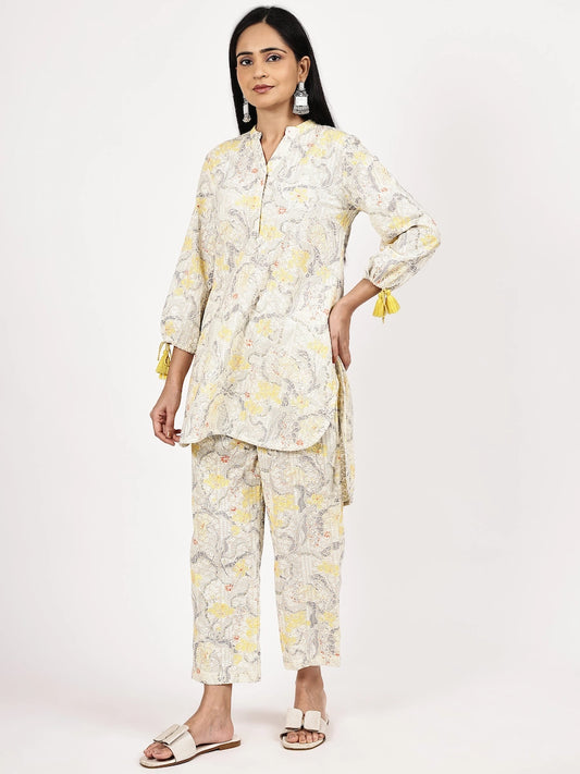 Yellow & White Schiffli Co-ord Set with Digital Print
