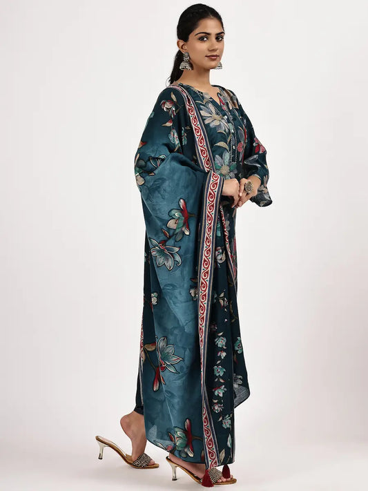 Dark Teal Floral Printed Kurta Set with Pants & Dupatta