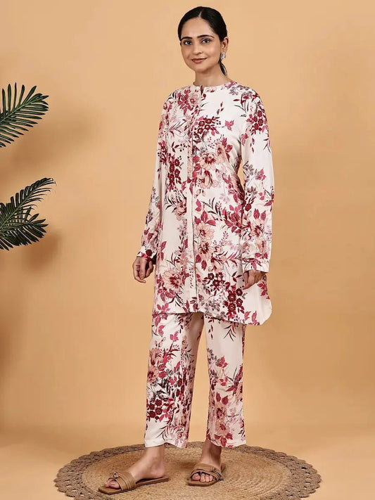 White Maroon Floral Printed Co-ord Set
