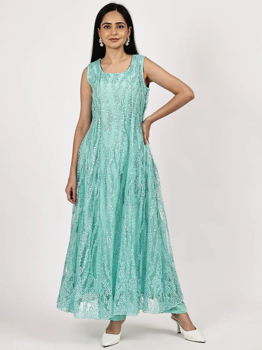 Aqua Blue Sleeveless Embroidered Anarkali with Olive Dupatta