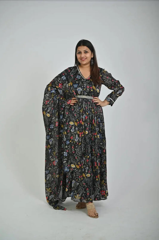 Grey Printed Kurta Along With afghani Printed Pants and printed Dupatta