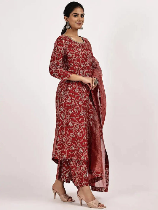 Maroon Printed Viscose Blend Kurta Set with Dupatta