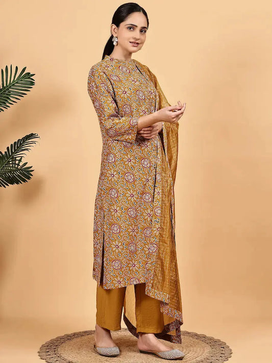 Mustard Yellow Viscose Blend Kurta Set with Lace Detailing
