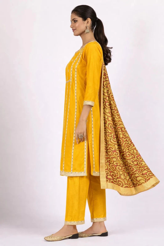 Mustard Yellow Embellished Kurta with Trousers and Printed Dupatta Set