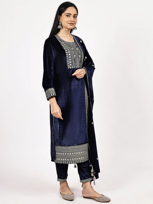 Navy Blue Embroidered Velvet Kurta Set with Dupatta
