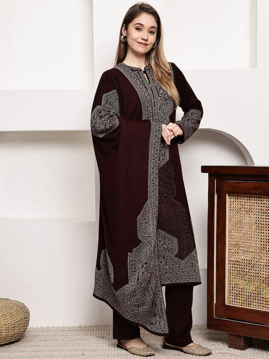 Maroon Acrylic Jacquard Winter Kurta Set with Matching Dupatta