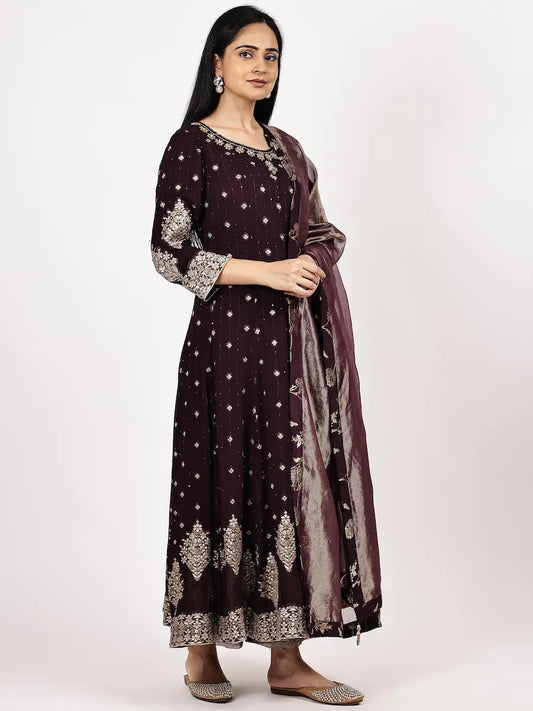 Deep Brown Brocade Anarkali Kurta Set with Zari Dupatta