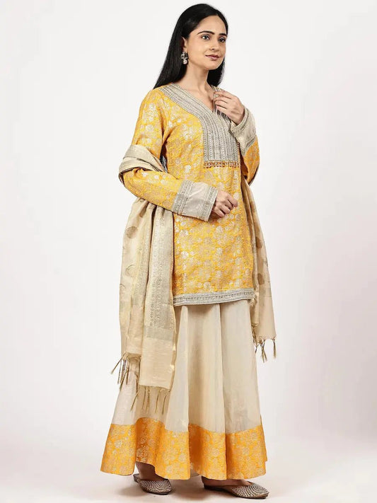 Yellow Silk Jacquard Kurta Set Dupatta Elegant Festive Party Wear