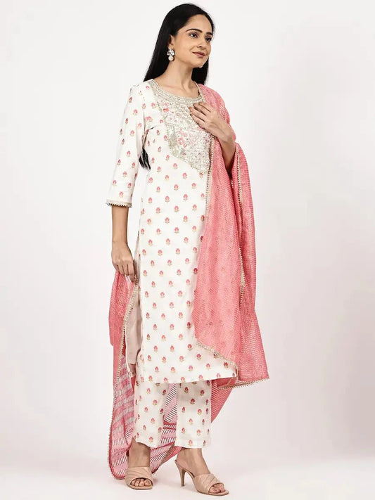 Off White Kurta Set with Pink Print and Matching Pink Dupatta