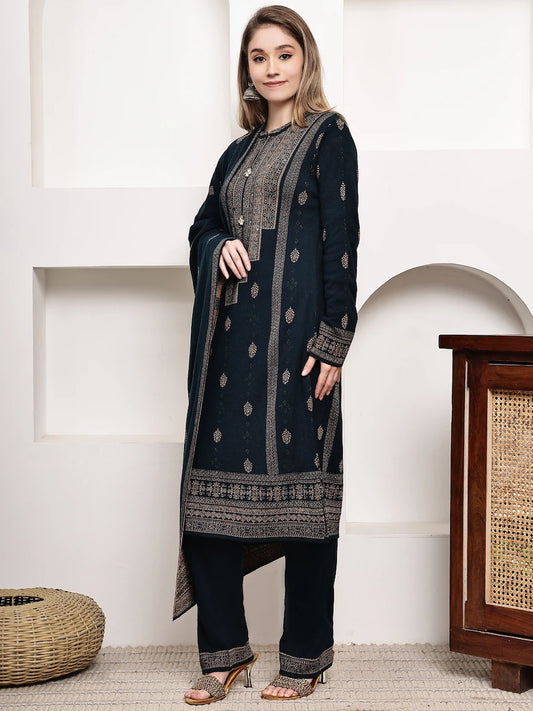 Navy Blue Acrylic Jacquard Kurta Set with Full Sleeves and Dupatta