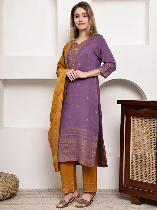 Purple Embroidered Kurta Set with Mustard Dupatta