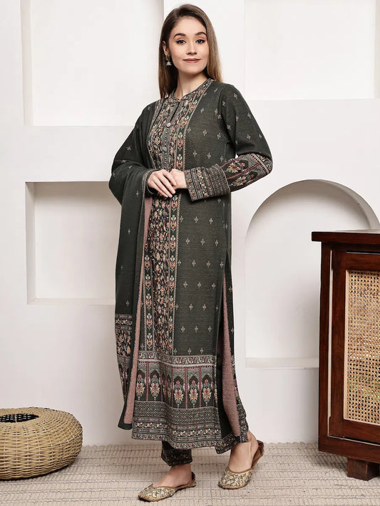 Elegant Dark Olive Green Acrylic Jacquard Kurta Set with Full Sleeves and Intricate Dupatta
