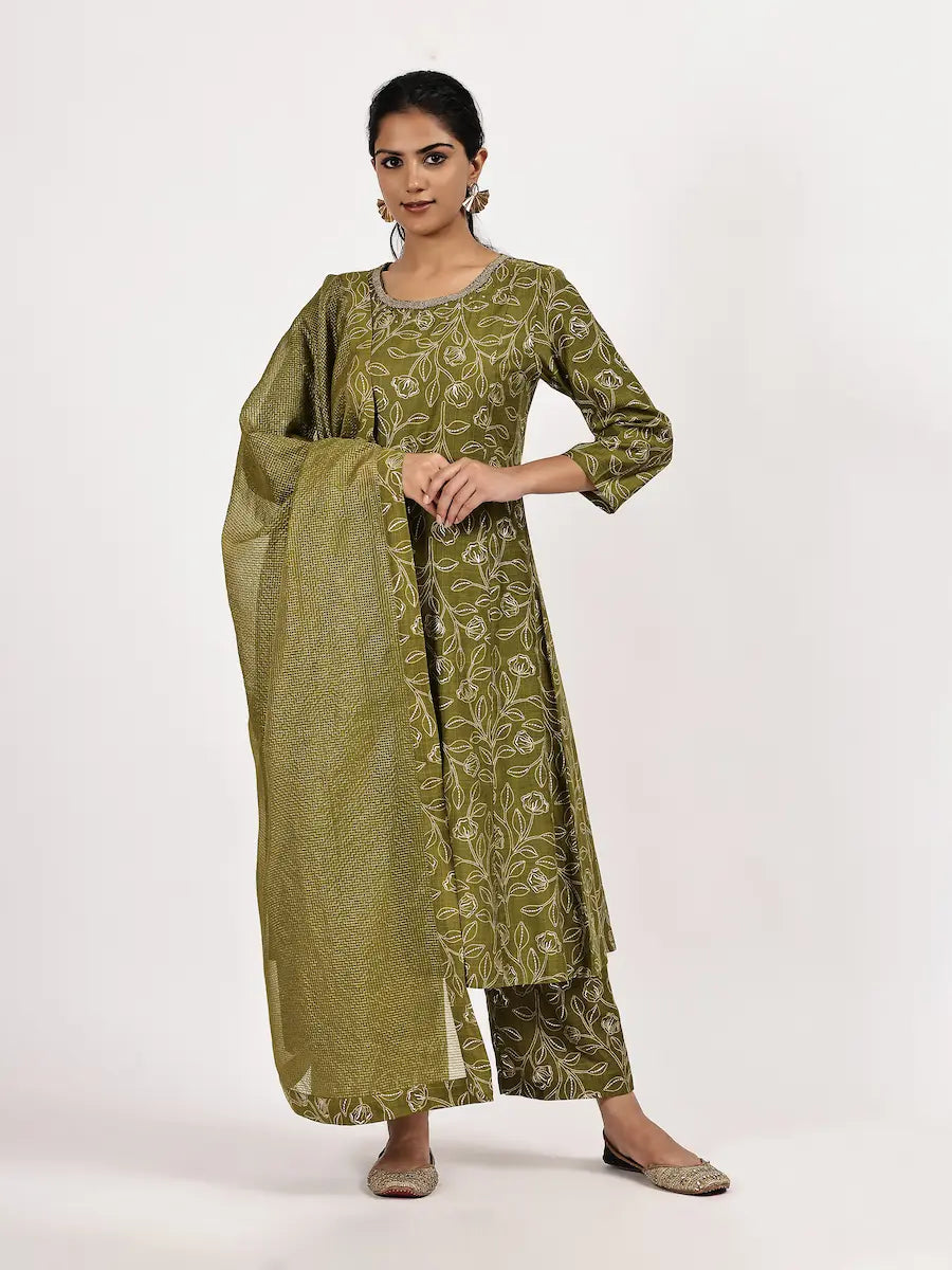 Mehndi Green Viscose Blend Embroidered Kurta Set with Dupatta